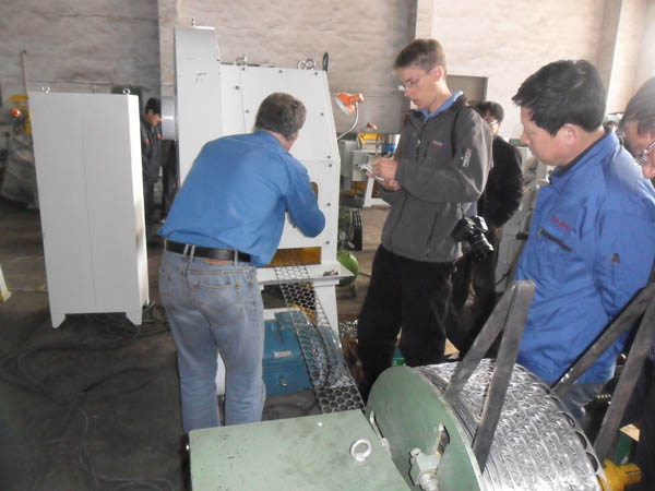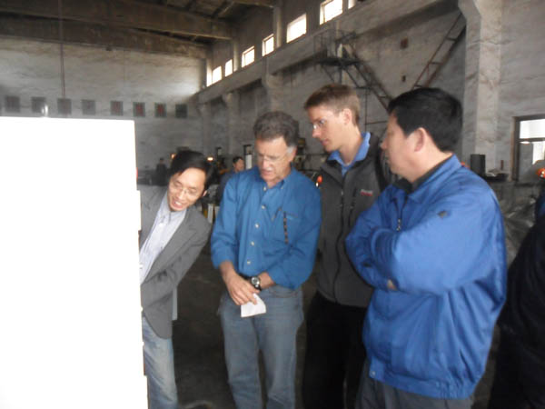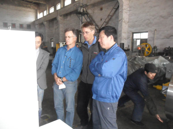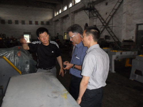 阜新匯新機械有限公司領(lǐng)導(dǎo)與國外客商溝通匯新多功能臥式?jīng)_床的特點。